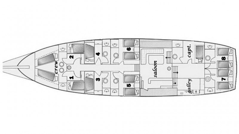 1 master cabin, 5 double cabins and 2 twin cabins for 16 guests.